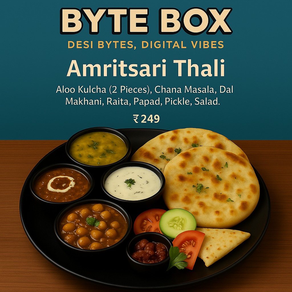 👑 Amritsari Royal Thali, Flaky Aloo Kulchas cradle hearty Chana Masala, with velvety Dal Makhani adding regal depth. Cool Raita, crispy Papad, tangy Pickle, and fresh Salad bring contrast and crunch. A soulful vegetarian spread that channels the vibrant streets of Amritsar—comfort, richness, and tradition layered in every bite. Served hot, served proud.