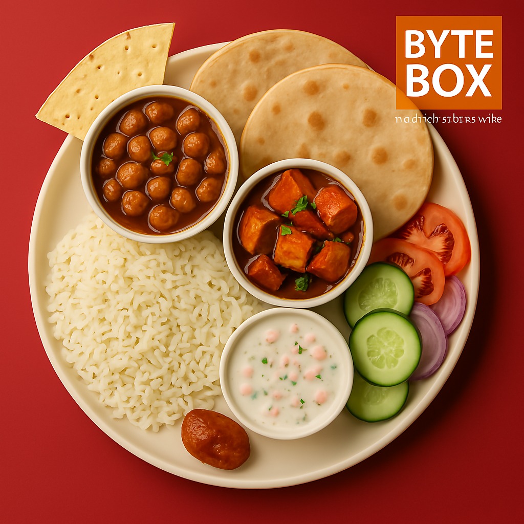 🌶️ Spice Hustle Combo, Bold Chole-Chawal sets the pace, with smoky paneer—Kadhai or Tikka—bringing the fire. Ghee-soft chapatis cradle every bite, while raita, pickle, papad, and salad deliver cool crunch and kick. A feast that’s loud, proud, and unapologetically flavorful. No filler, just hustle—desi heat served Byte Box style.